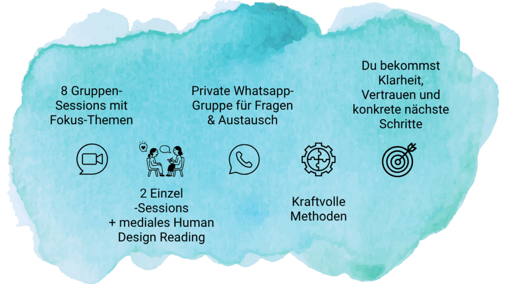 Das Programm dauert 4 Monate und umfasst 8 Gruppensessions à 2 Stunden, 2 Einzelsessions und ein Human Design Reading. Die Treffen finden online über Zoom statt. Zusätzlich gibt es eine geschlossene WhatsApp-Gruppe für Austausch und Fragen.